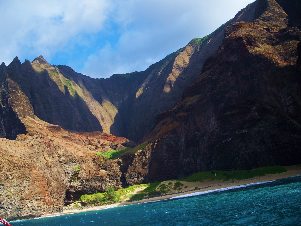 1.  Beauty of the land:  Like most Hawaiian islands the steep tall mountains divide the island between lush rain forest and very dry arid areas.   This is of course known as the windward/leeward effect of the mountains stopping prevailing sea-winds, thus moisture, in the form of rain falls on the windward (Usually east and north east side) of the island.  This is quite pronounced in Kauai.   As I recall, there is a small area of the island that receives more rain than any other point in the United States.   There are many waterfalls, some quite high and long as a result of the rain.   As you travel around the island look at the mountains, and you will likely see water falls in various places.