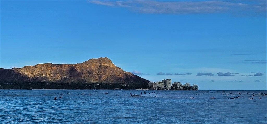Honolulu is a very large city like Houston or Dallas.  It so happens the beautiful sea is on one side and lush green mountains are on the other side.   There is a beautiful long beach park, I think with the name of Alia Morena, downtown in Honolulu.   This is a great place to enjoy the beach, the boat harbor, or simply watch surfers with the city and Diamond Head in the background.   Beware while in Honolulu of your surroundings.  Even though much of the city’s economy is based on tourism, and is safe, it is still the typical large city.  Just beware, but enjoy.