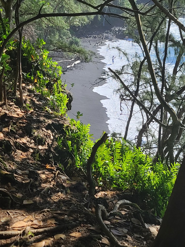 As it turned out, there the Kehena Black Sand Beach is only about a hundred yards up the road, then about twenty yards DOWN a sea-cliff.   Once I had my stuff transferred from the car into the cottage, I changed and headed to the beach.  There was no simple, safe way down the cliffside to the beach.  Over the years, erosion and local people created, not steps in the sense of steps as we know it; but places one could put feet, hang on to the jagged lava next the path, and carefully make the way down, without falling over the cliff.  I had read about the path and the difficulty, but wow!!!   The last ‘step’ was about a four-foot jump to the soft black sand below.   As I did this, I thought to myself:  ‘how the heck am I going to get my Lard-Butt up this first step to start the climb up…. Oh well….