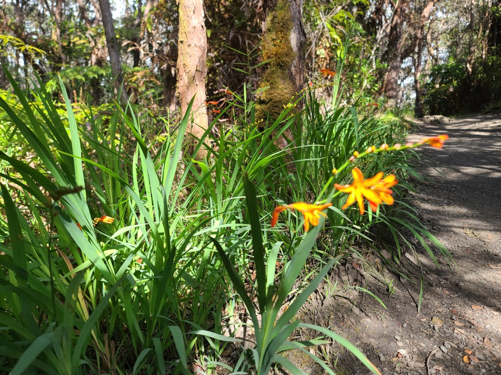 The day turned out to be a really good day!  As I shared earlier, my day started with a couple hours down at the beach, then the drive to the volcanos.   I will have to poke fun at myself a bit…again, I am not ‘the sharpest turnip on the truck’…LOL.  So I reached the parking lot for the lava tour walk.  There was a trail for a one mile walk along the rim of the crater to the entry point to the tube, or a half mile walk.   You guessed it:  I made a mistake and took the long route…DUH!   So a mile walk each way to the entry point, then DOWN a fifteen minute walk on gently sloping sidewalk and steps.  This took me to the bottom of the deep rain forest.   Then the half mile walk through the lava tube, then the walk back UP to the top, then the mile walk back to my car…..I was TIRED!   This 70 year old body got a work out for sure!!  You will see however the walk was not in vain, as I got some nice photos of nature.  The little tropical yellow wild flower you will see kept catching my eye.  These are everywhere!  Something of such beauty being displayed by nature sort of randomly, makes one happy to be alive.