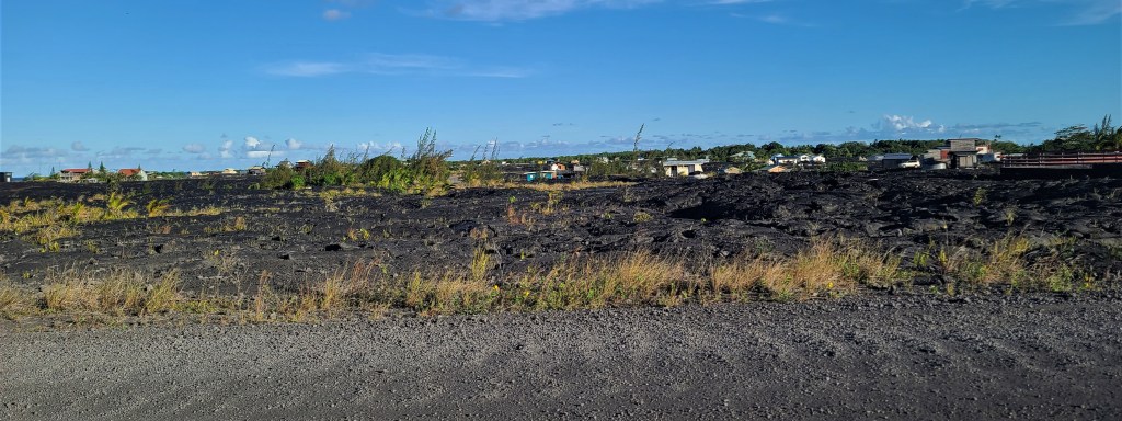 The lava photos show a few interesting things:  It shows both nature and man’s determination to survive.   You will see small trees and plants growing out of the lava, and  houses scattered across the lava field.  Folks who owned land here, apparently are reclaiming their land and building small homes, where homes destroyed by the lava flow years ago.